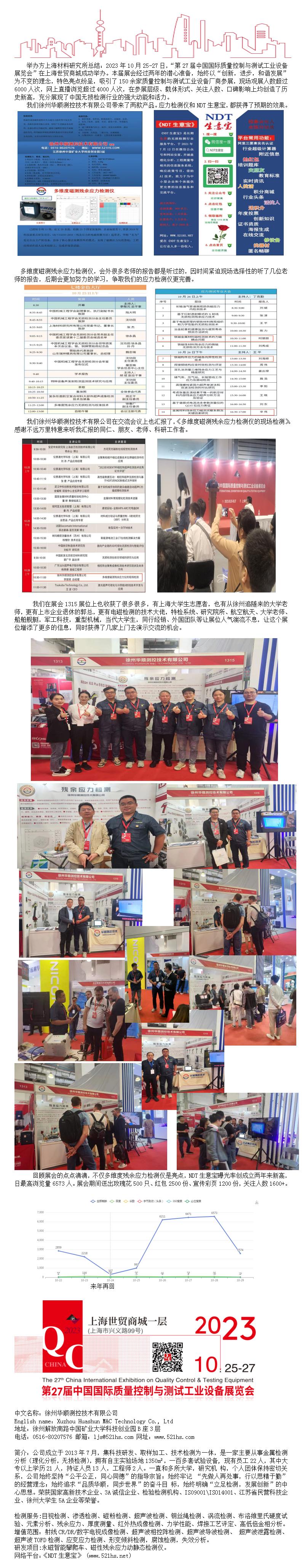 舉辦方上海材料研究所總結:2023年10月25-27日,“第27屆中國國際質量控制與測試工業設備展覽會”在上海世貿商城成功舉辦。本屆展會經過兩年的潛心準備,始終以“創新,進步,和諧發展”為不變的理念,特色亮點紛呈,吸引了150余家質量控制與測試工業設備廠商參展,現場觀展人數超過6000人次,網上直播瀏覽超過4000人次,在參展層級、載體形式、關注人數、口碑影響上均創造了歷史新高,充分展現了中國無損檢測行業的強大動能和活力。