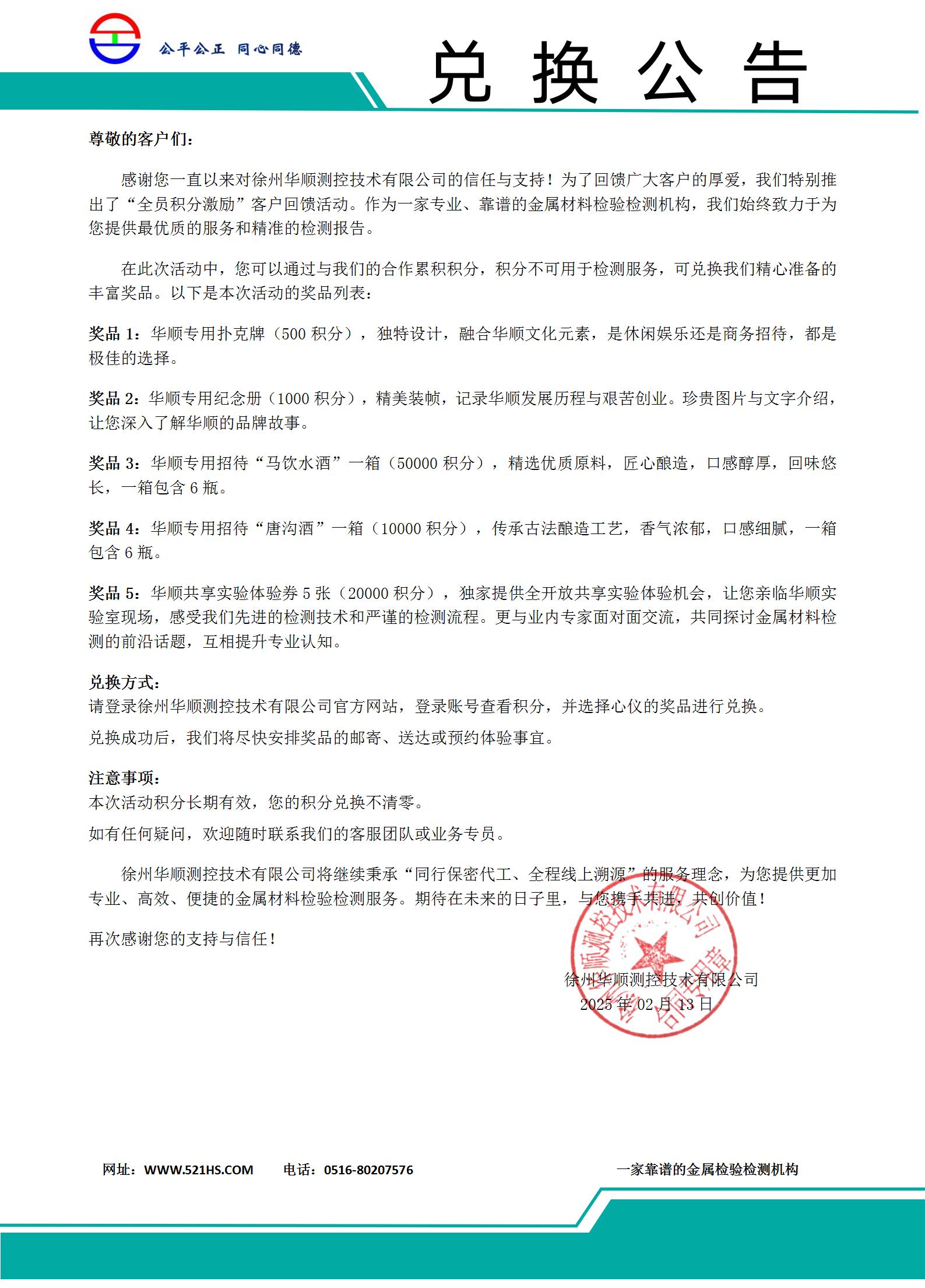 感謝您一直以來對徐州華順測控技術有限公司的信任與支持!為了回饋廣大客戶的厚愛,我們特別推出了“全員積分激勵”客戶回饋活動。作為一家專業、靠譜的金屬材料檢驗檢測機構,我們始終致力于為您提供最優質的服務和精準的檢測報告。